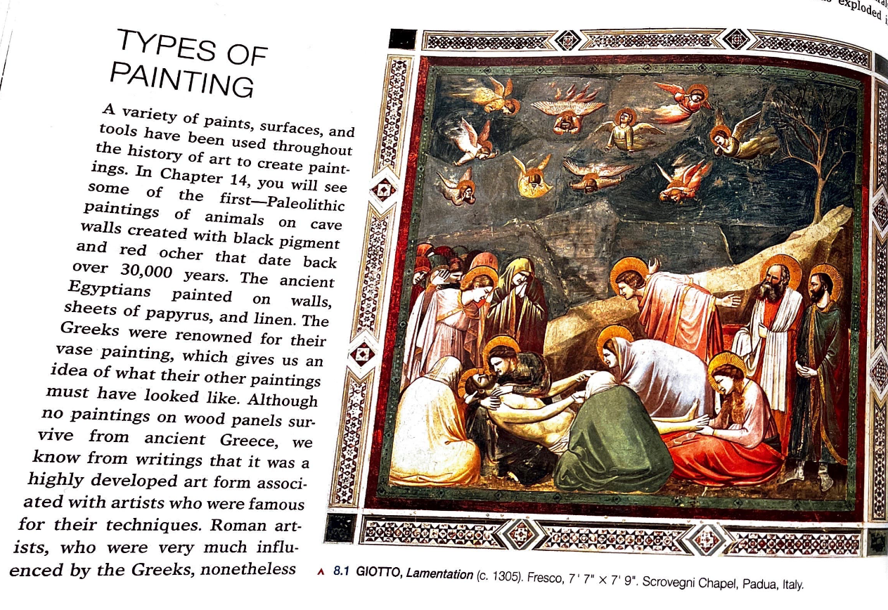 This figure represents a painting named ‘Lamentations’ or Lamentation of the Death of Christ. The artist’s name is Giotto, an Italian painter with true masterpieces when it comes to art. The technique used to paint is a fresco, which is a mural painting technique used by many artists.