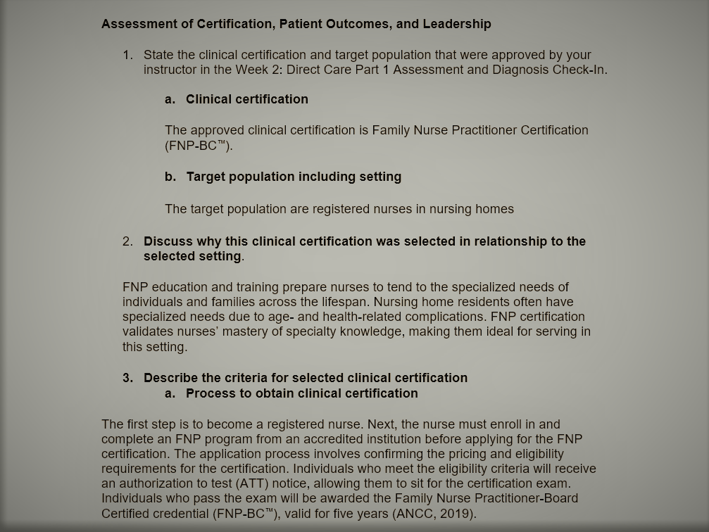 1. State the clinical certification and target population including setting that were approved by your instructor in the Week 2: Direct Care Part 1: Assessment and Diagnosis Check-In.